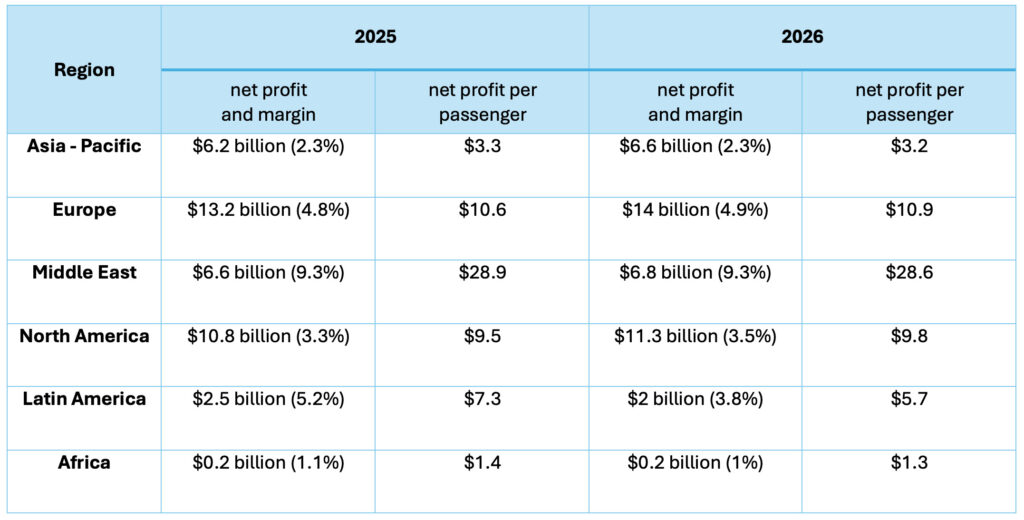 The Middle East remains the strongest region in terms of net profit margins and per passenger profit. This stems largely from the region’s strategic role of a global hub. Passenger demand remains high, driven by long-haul traffic and the expansion of hub carriers. However, conflicts and the tense situation in the region remain the biggest problem.